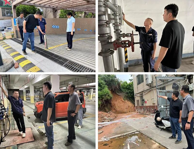 8月12日下午,公司领导带队前往吉吉高宿舍、莲浦小区和兰庭小区开展防御台风安全检查。检查组查看吉吉高宿舍停车场现场情况,要求工作人员要根据台风情况,及时对现场进行防护,拉好警戒线,提醒人员不要靠近。在物业小区,以地下停车场为重点检查区域,对沙袋、挡水板、抽水泵等应急物资的配备数量、摆放位置、性能状态进行检查,要求现场工作人员要全面排查,保障应急物资随时可用、相关设施运行正常。此外,还对现场的排水口进行排查,要求人员及时清理排水管道杂物,确保排水管网畅通无阻;并督促物业小区通过公告栏、业主群等多渠道发布台风预警温馨提示,提醒居民做好个人防护。