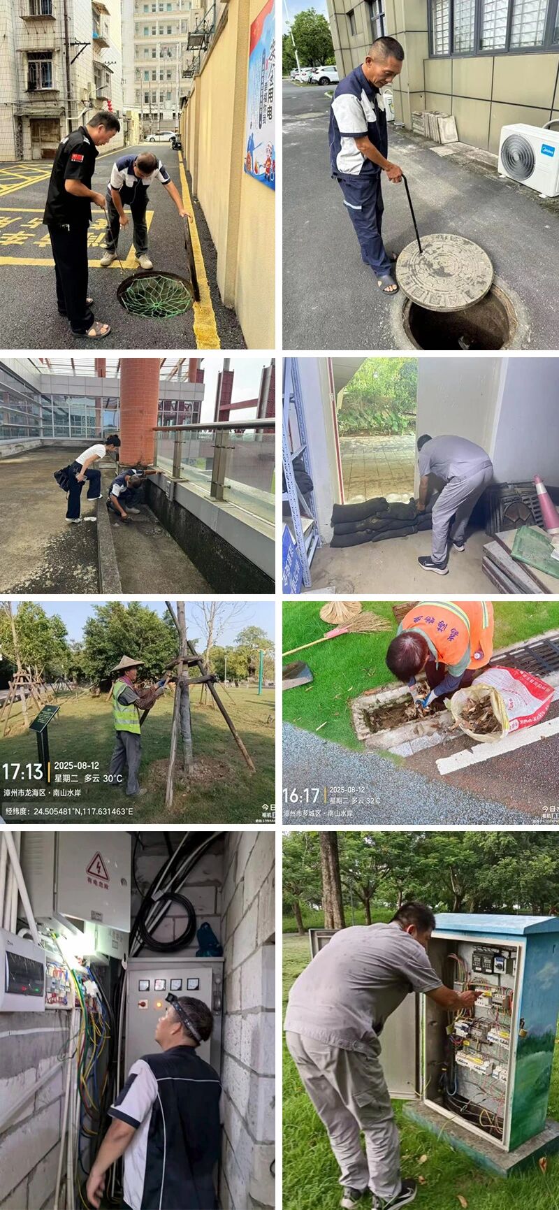 荔海物业公司组织工作人员对各物业服务项目的排水沟渠、雨水篦子、地下管网及集水井展开全面细致的疏通工作;对天台旗杆、空调等设施,工作人员仔细检查并加固连接部位,确保其稳固可靠;针对易倒伏树木,园林养护人员根据树木情况采用支撑架、拉索等方式进行加固,并修剪枯枝病枝,降低树木在台风中的受力面积;检查配电房、污水池、抽水泵等关键设施的试运行情况,并保障污水池和抽水泵等排水设备能正常启动和运行,及时排除积水。