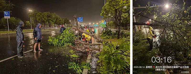 ▲受台风影响,区内主要道路出现多处绿化苗木倒伏,市政公用公司连夜出动,20分钟内赶到现场并处理完成第一批倒伏乔木。8月13日深夜至14日凌晨,共处理影响交通通行的倒伏苗木20余株。