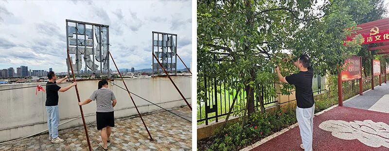 ▲教育集团公司对物业管养单位户外设施进行加固,对绿化区域实施抗风修剪。