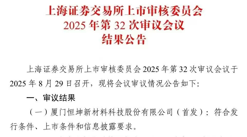 据上交所上市委2025年第32次审议会议结果公告,恒坤股份(首发)符合发行条件、上市条件和信息披露要求。