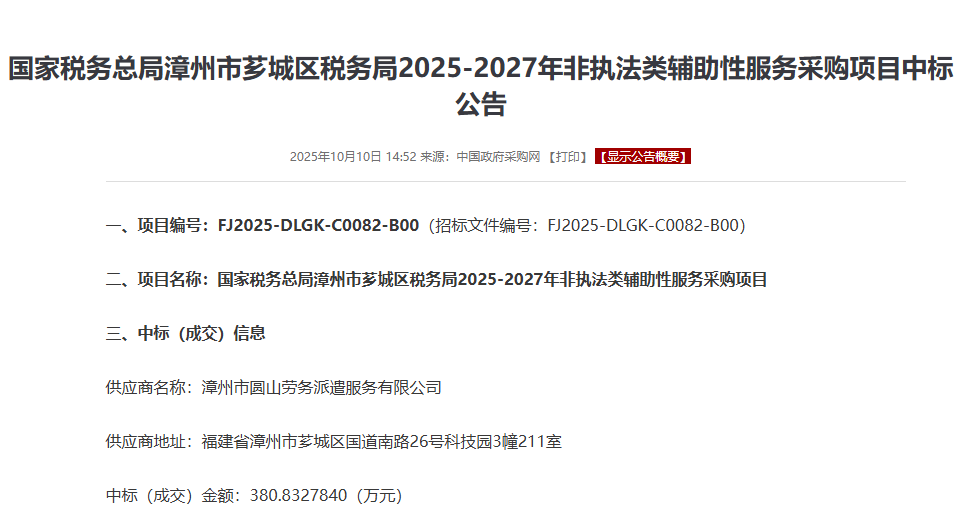 10月10日,漳州高新人力资源有限公司下属漳州市圆山劳务派遣服务有限公司成功中标国家税务总局漳州市芗城区税务局2025-2027年非执法类辅助性服务采购项目,为公司业务市场化发展再添佳绩。