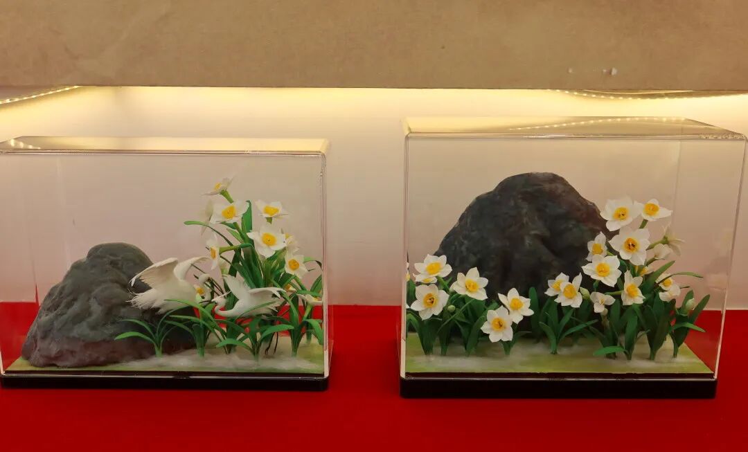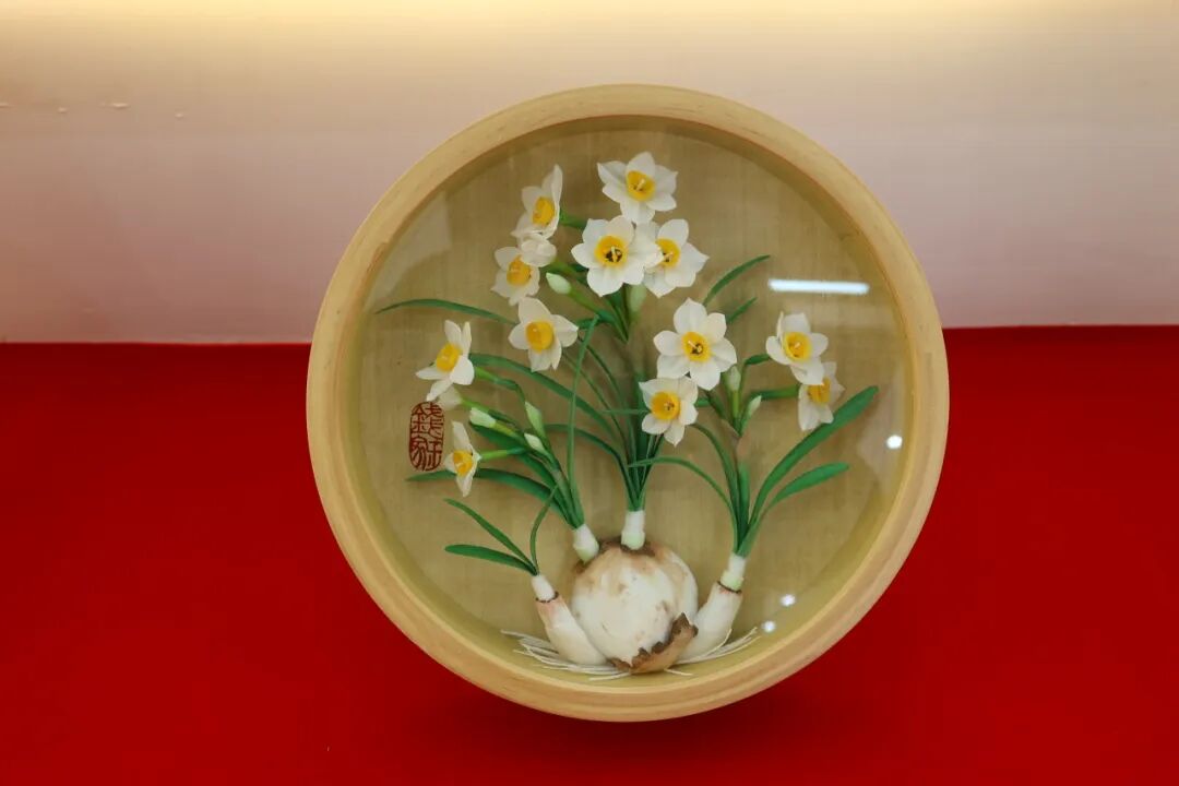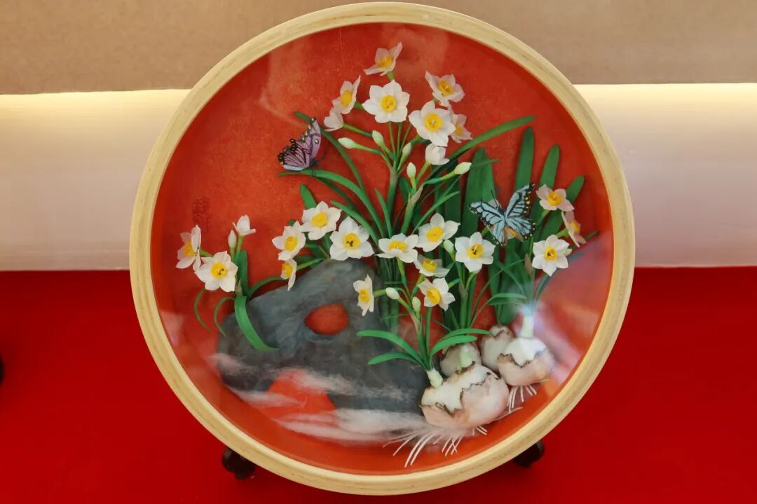 棉花画是漳州地区独创的民间艺术形式,以天然棉花为原料,通过搓、捻、塑、粘等技法,结合水仙花的形态特征与文化寓意,创作出栩栩如生的立体画作。水仙花公司推出的《蝶梦水仙间》《丹色水仙蝶影》《圆山仙影》等作品,既保留了传统棉花画的柔美质感,又融入了漳州水仙花的清雅气质。