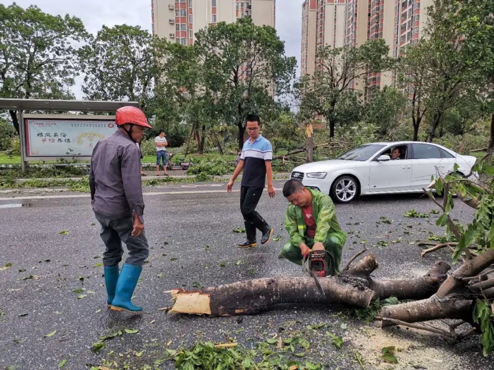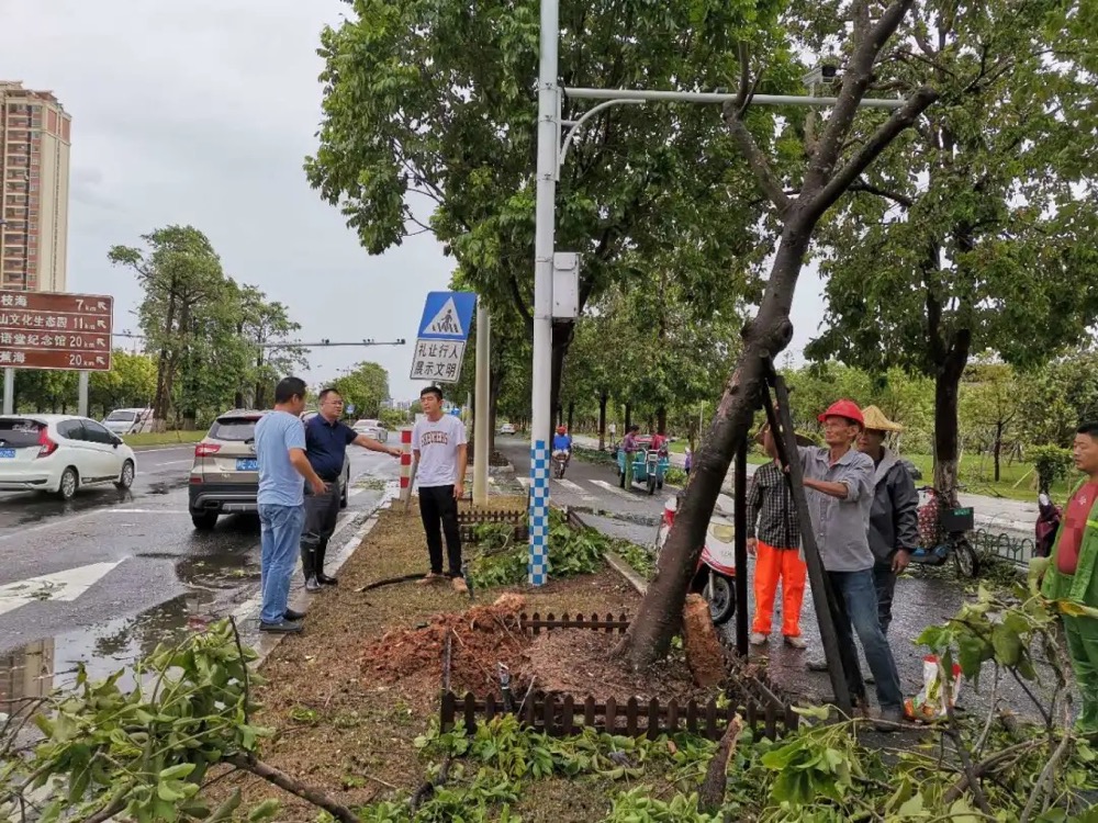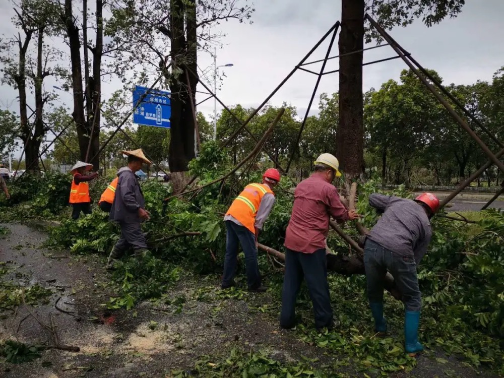 组织人员到主次干道、公园的灾后巡查工作,邀请会同园林专家现场查看指导,及时扶正了若干棵松动倾斜、倒伏树木,清理路面上的大小断枝,据不完全统计,处置倒伏、断枝树木2000余株、路灯30杆。还组织人员做好公园及周边隐患排查工作,巡查确保南湖公园、动物园及九湖公园周边水位正常,荔枝海公园山体无出现滑坡。当天下午,工作人员持续对水仙花海的水利问题进行一一排查,工作人员对部分路段泥石进行清理,避免土石堵塞的汛涝问题影响农作物的生长。