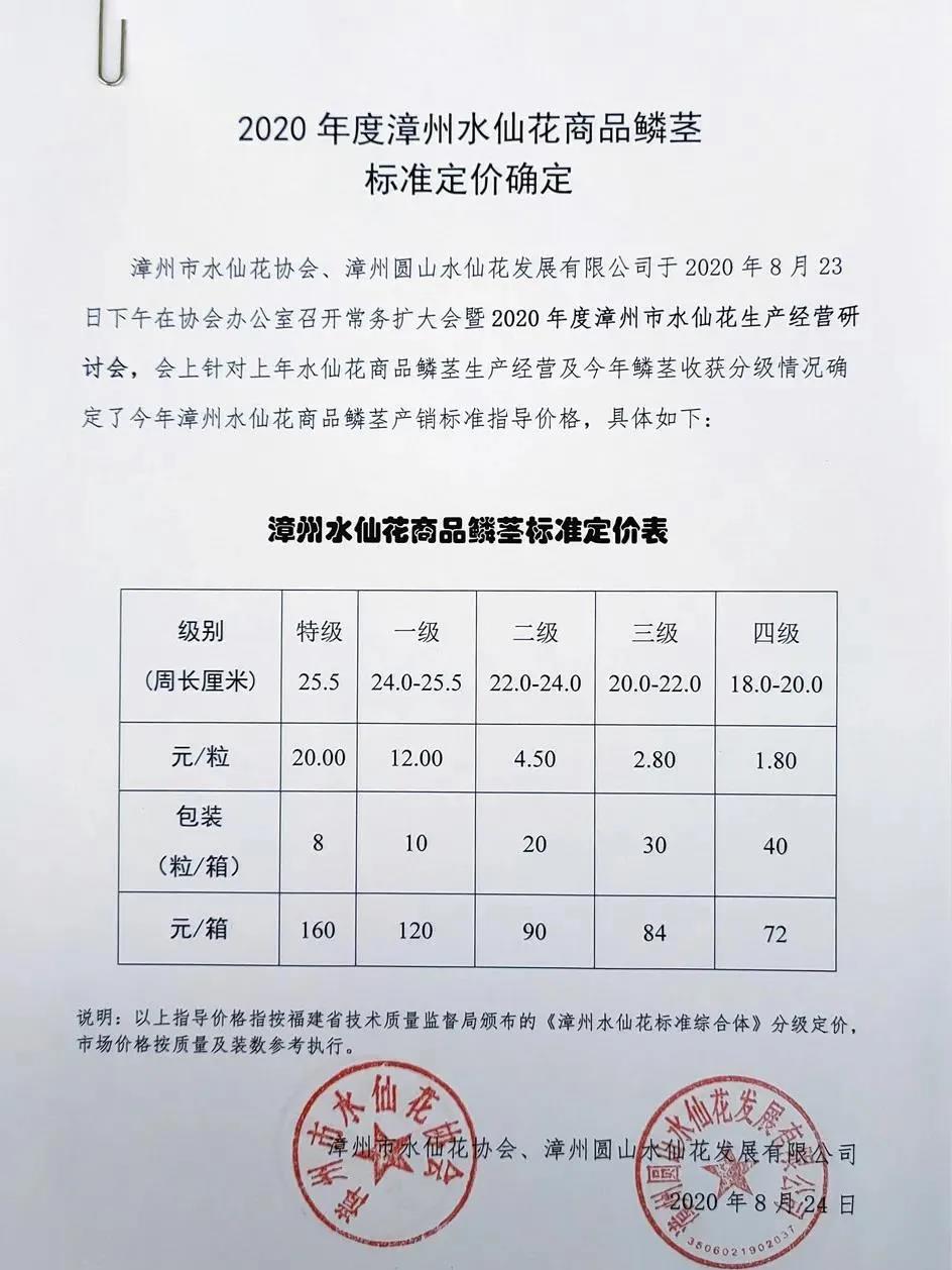 漳州市水仙花协会、漳州圆山水仙花发展有限公司于2020年8月23日下午在协会办公室召开常务扩大会暨2020年度漳州市水仙花生产经营研讨会,会上针对上年水仙花商品鳞茎生产经营及今年鳞茎收获分级情况确定了今年漳州水仙花商品鳞茎产销标准指导价格,具体如下: